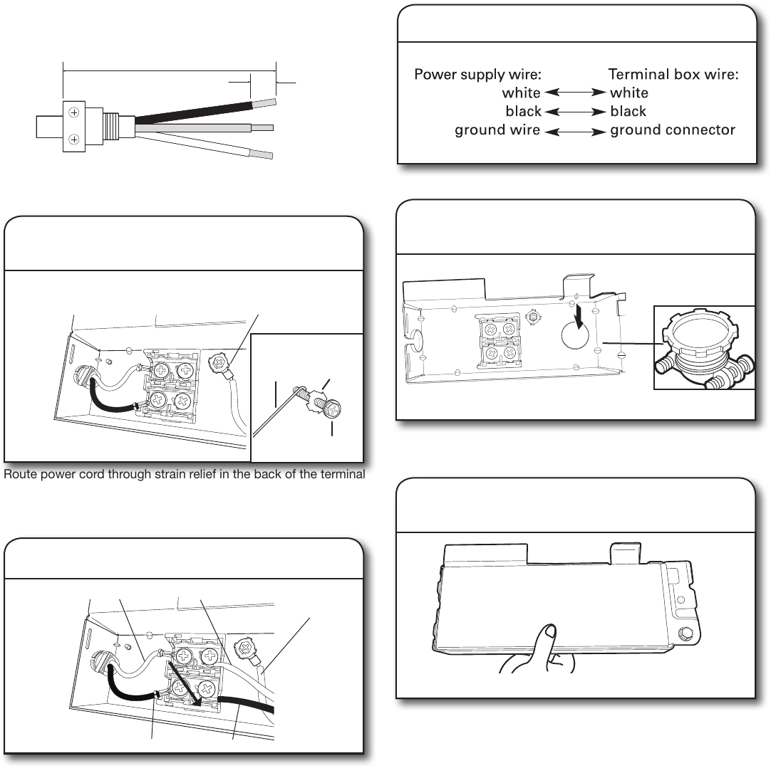 Place wires inside terminal box. Replace the cover by inserting