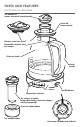 PARTS AND FEATURES PARTS AND ACCESSORIES Tea steeper lid (center section of lid with handle) Kettle lid (outer section) Stainless steel lime scale filter Removable stainless steel tea steeper Glass tea kettle Kettle handle Kettle base On/Off button Temperature selector Tea steeper assembly: Removable stainless steel tea steeper* and Tea steeper lid* *Part also shown above Tea steeper holder Cord wrap (on underside of base)