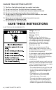 ENGLISH GLASS TEA KETTLE SAFETY IMPORTANT SAFEGUARDS When using electrical appliances, basic safety precautions should always be followed, including the following: 1. Read all instructions. 2. Do not touch hot surfaces. Use handles or knobs. 3. To protect against fire, electrical shock and injury to persons do not immerse base, cord, plug, or the Glass Tea Kettle in water or other liquids. 4. Close supervision is necessary when any appliance is used by or near children. 5.