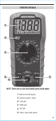 FEATURE DETAILS 1 6 2 3 5 4 NOTE: There are no user-serviceable parts inside meter. 1. 2000 count LCD display 2. Function selector switch 3. "10A" jack 4. "COM" jack 5. "VΩ" jack 6.