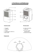 4. Funktionen und Bedienung Vorderansicht Rückansicht 1. Tragegriff 2. Bedienfeld 3. Luftfilter 4. Lamellengitter (Lufteinlass) 5. Wassertank 6. Luftauslasslamellen 7. Kabelhalter 8. Anschlussstutzen Dauerdrainage 9.