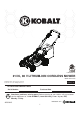 ITEM #0667318 21 IN., 80 V LITHIUM-ION CORDLESS MOWER MODEL #KM 2180B Français p. 23 KOBALT® and the K Design® are registered trademarks of LF, LLC. All Rights Reserved. Español p. 45 ATTACH YOUR RECEIPT HERE Serial Number Purchase Date Questions, problems, missing parts? Before returning to your retailer, call our customer service department at 1-888-3KOBALT (1-888-356-2258), 8 a.m. - 8 p.m., EST, Monday - Friday. kobalttools.
