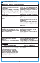 DÉPANNAGE TYPE DE JET/PROBLÈME Aucune pulvérisation CAUSES POSSIBLES SOLUTION 1) Aucune pression d’air 1) Vérifiez l’alimentation en ne se rend au pistolet air et les conduits d’air. de pulvérisation. 2) Ouvrez le bouton de 2) Le bouton de réglage réglage du fluide. du fluide n’est pas Augmentez la pression de assez ouvert. fluide du réservoir. 3) La peinture est trop 3) Diluez la peinture. épaisse. Fuite de fluide de l’écrou 1) Le presse-garniture 1) Lubrifiez le presse-garniture.
