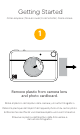 Getting Started Cómo empezar | Mise en route | Erste Schritte | Come iniziare 1 Remove plastic from camera lens and photo cardboard. Retire el plástico del objetivo de la cámara y el cartón fotográfico. Retirez le plastique de l'objectif de l'appareil photo et du carton photo. Entfernen Sie das Plastik vom Kameraobjektiv und vom Fotokarton. Rimuova la plastica dall'obiettivo della fotocamera e dal cartone fotografico.