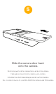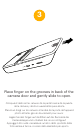3 Place finger on the grooves in back of the camera door and gently slide to open. Coloque el dedo en las ranuras de la parte trasera de la puerta de la cámara y deslice suavemente para abrirla. Placez un doigt sur les rainures à l'arrière de la porte de l'appareil photo et faites glisser doucement pour ouvrir. Legen Sie den Finger auf die Rillen auf der Rückseite der Kameraklappe und schieben Sie sie vorsichtig auf.