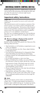 INDEX Important safety instructions Device summary Initial use PAGE 2 3 4 Unpacking the device / checking the package contents Inserting the batteries Operating components 4 4 5 LCD display 5 Buttons SETUP - System settings Code Setup (Programming the remote control) 6 8 10 Programming by brand code search 10 Programming by manual code input 11 Programming by automatic code search System-Setup 11 13 Setting the time 13 Setting the date 13 Adjust contrast 14 Background Illumination