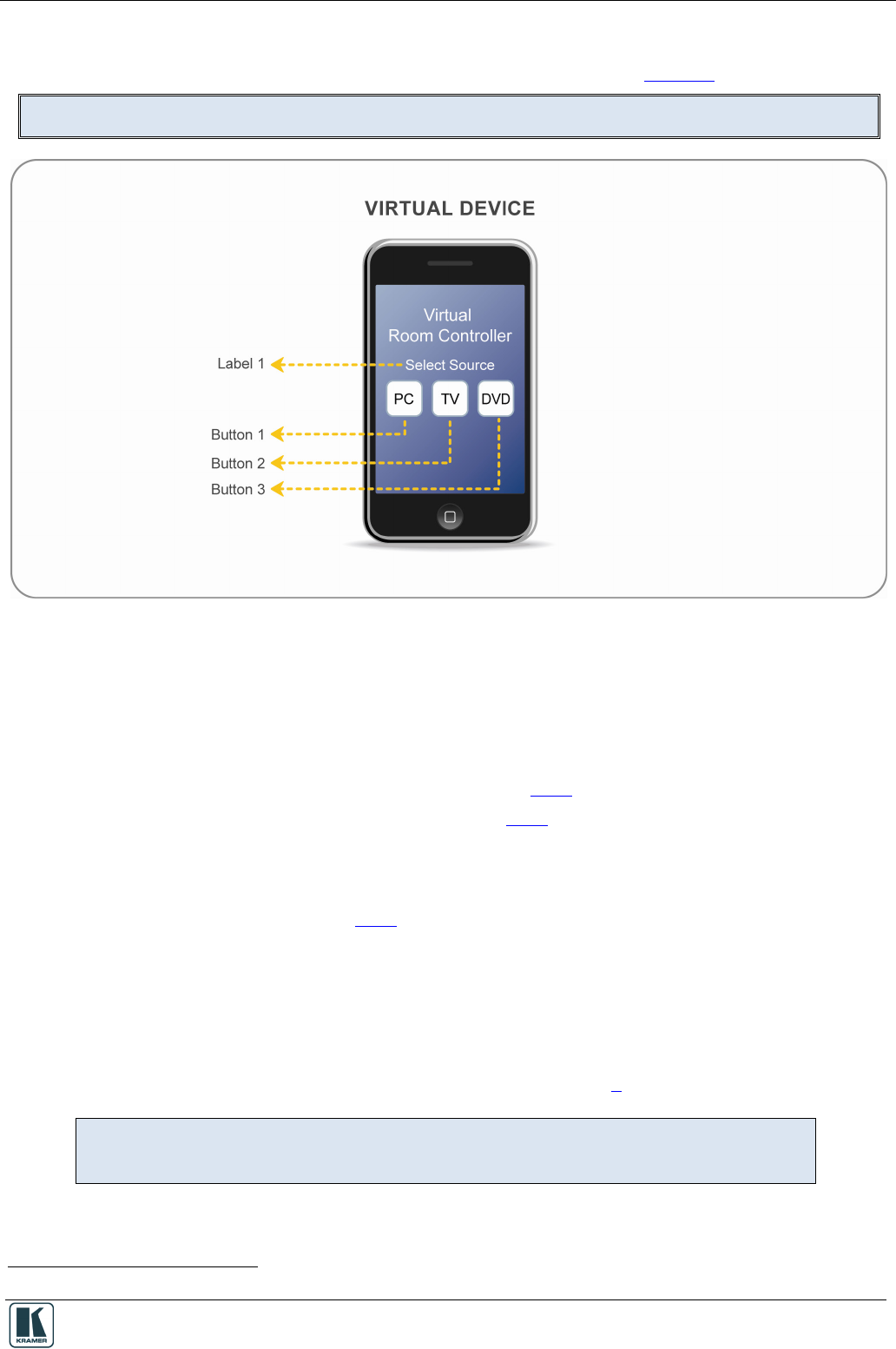 The Virtual Device screen includes three buttons that trigger the switching of a switcher, scaler or a