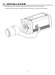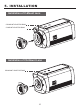 5. INSTALLATION • LENS CONNECTION Lenses are sold separately. Lenses such as an auto iris lens, CS-Mount lens and C-Mount lens can be used. NO TE • Please keep the lens clean. • Any foreign objects and Finger marks on the lens can cause inferior image quality in low light level conditions. When using an auto iris lens 1. Please peel off about 8mm of the outer skin of the auto iris lens cable. 2. Please peel off about 2mm of the outer skin of the insulated conductor inside the lens cable.