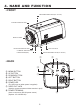 4. NAME AND FUNCTION • FRONT TRIPOD MOUNTING HOLE(1/4"-20 UNC) C-MOUNT ADAPTOR RING MOUNT COVER CS-MOUNT ADAPTOR RING AUTO IRIS JACK CS-MOUNT ADAPTOR RING FIXING SCREW(2EA) TRIPOD MOUNTING HOLE(1/4"-20 UNC) ① • BACK ② ⑤ ④ ①. MENU BUTTON ②. UP BUTTON ③. DOWON BUTTON ④. LEFT BUTTON ⑤. RIGHT BUTTON ⑥. POWER LED ⑦ ③ ⑧ (The LED turns on when power is supplied) Class 2 Only ⑦. VIDEO OUT JACK (Used to connect an external video monitor in jack) ⑧.