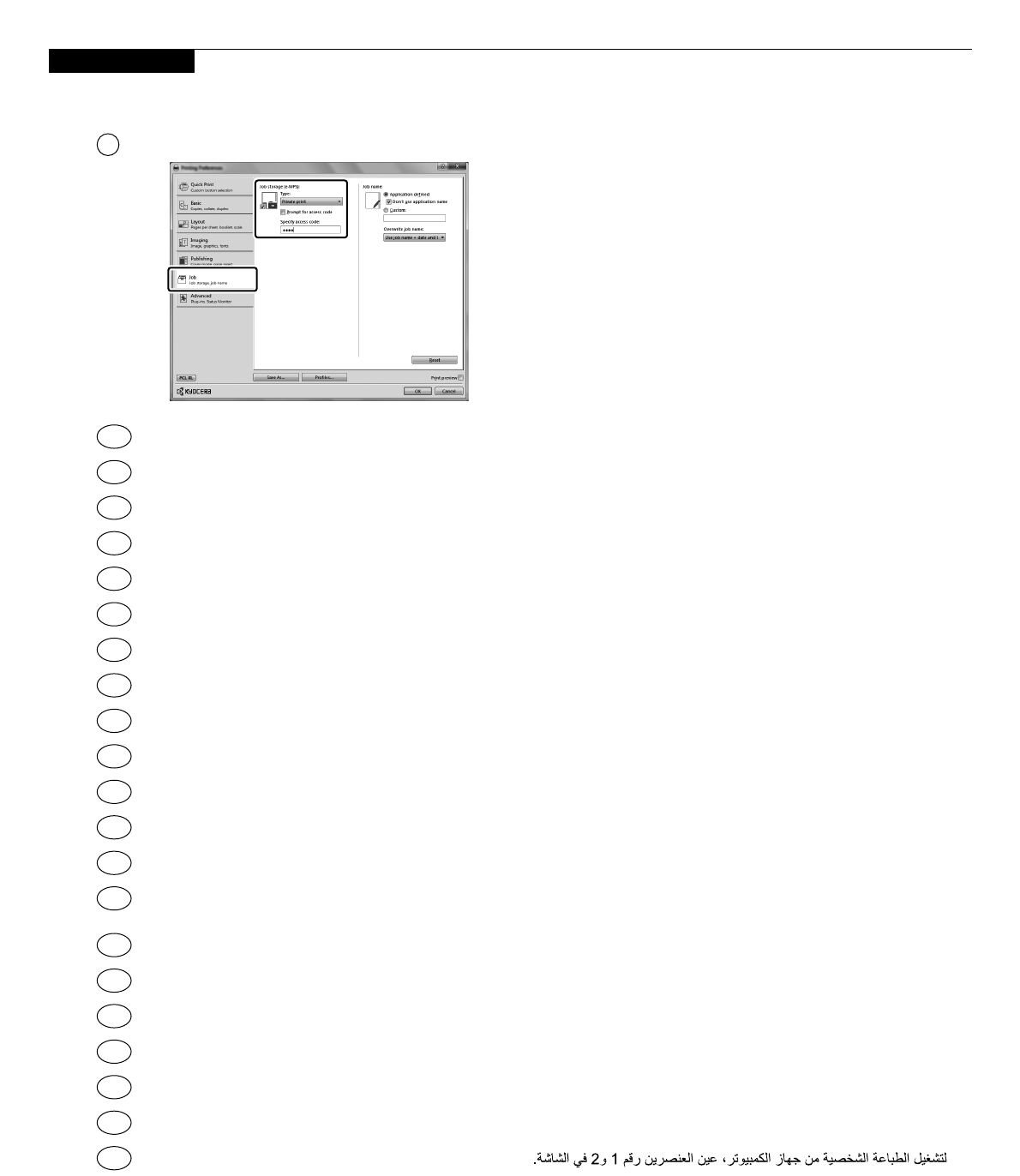 Aby aktywować drukowanie prywatne z poziomu komputera, skonfiguruj ustawienia oznaczone cyframi 1 i 2 na tym