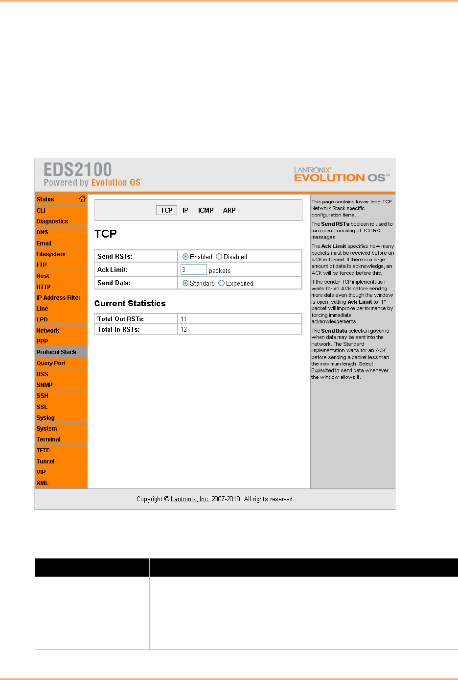 In the Protocol Stack web page, you can configure TCP, IP, ICMP, and ARP.