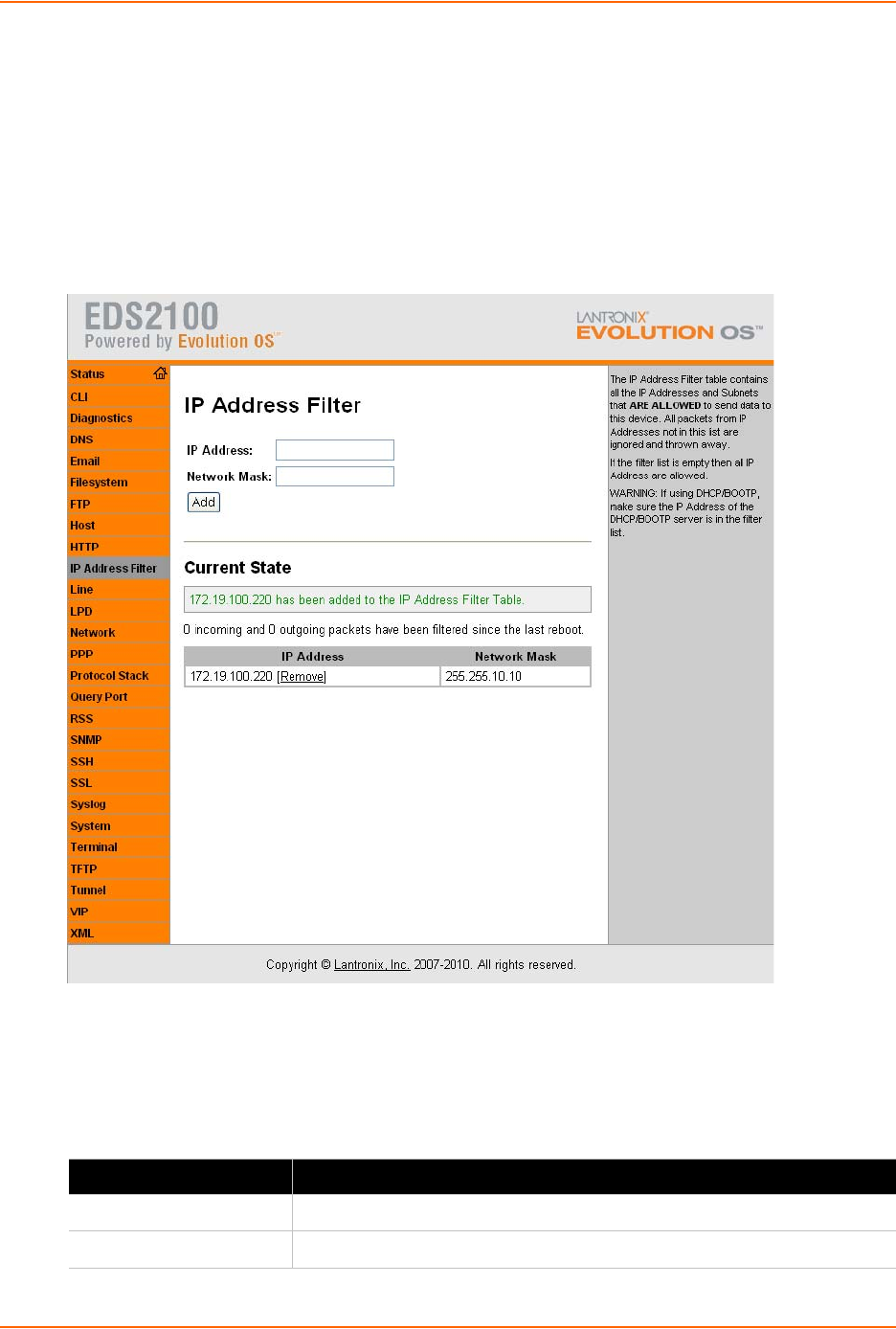 The IP address filter allows specified hosts and subnets to communicate with the EDS1100/2100.