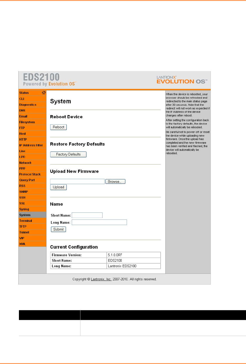 The System web page enables the rebooting of the device, restoring factory defaults, uploading
