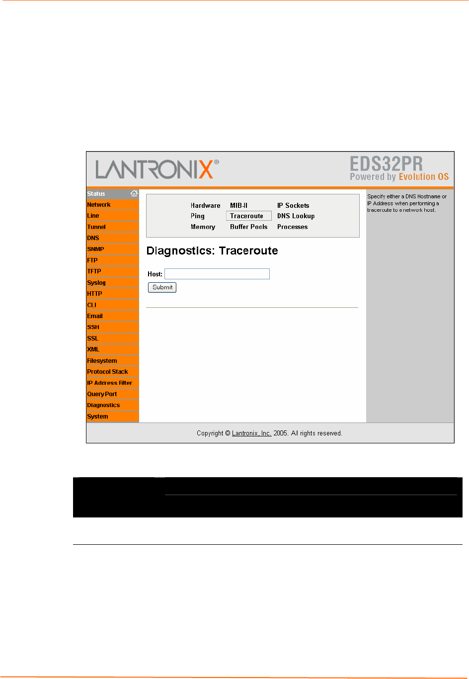 Traceroute page. Here you can trace a packet from the EDS to an Internet host, showing