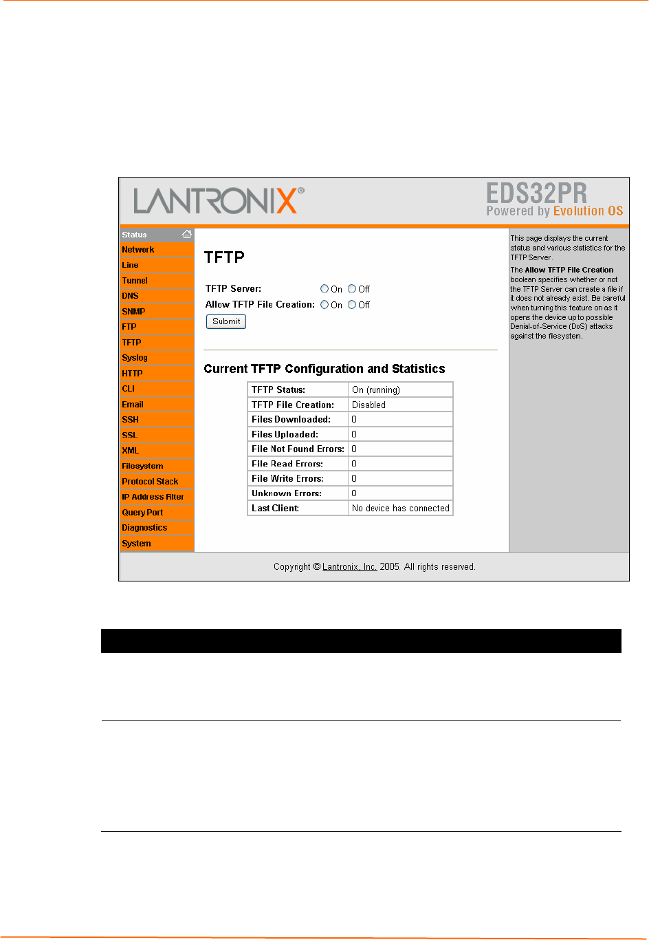 Clicking the TFTP link in the menu bar displays the TFTP page. This page displays the
