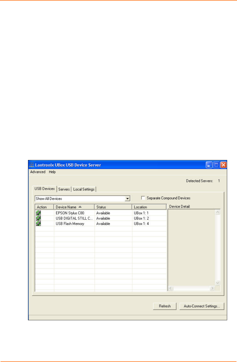 The Lantronix UBox USB Device Server window opens. The USB Devices tab