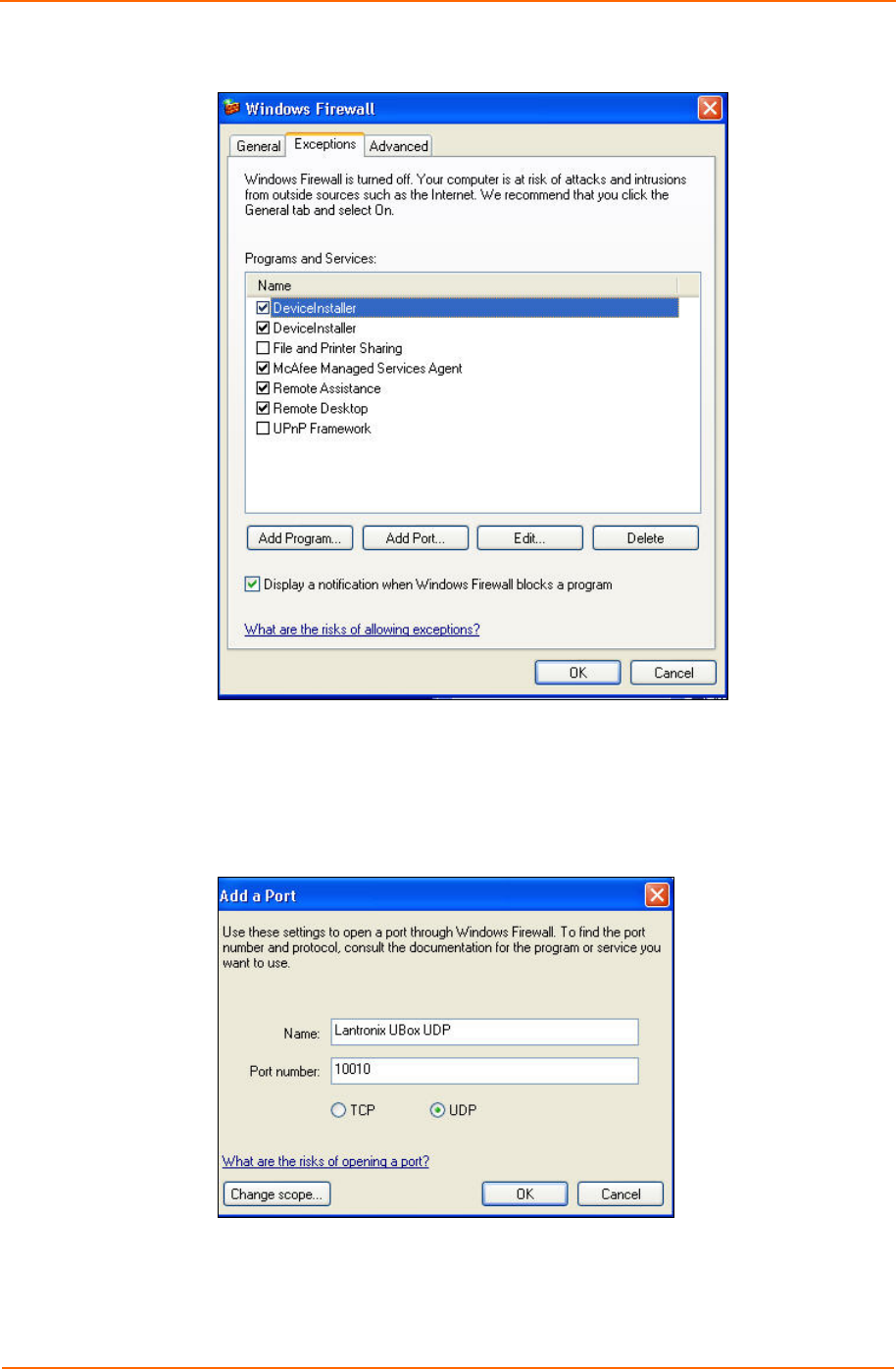 1. On the Exceptions tab, click the Add Port button. The Add a Port window
