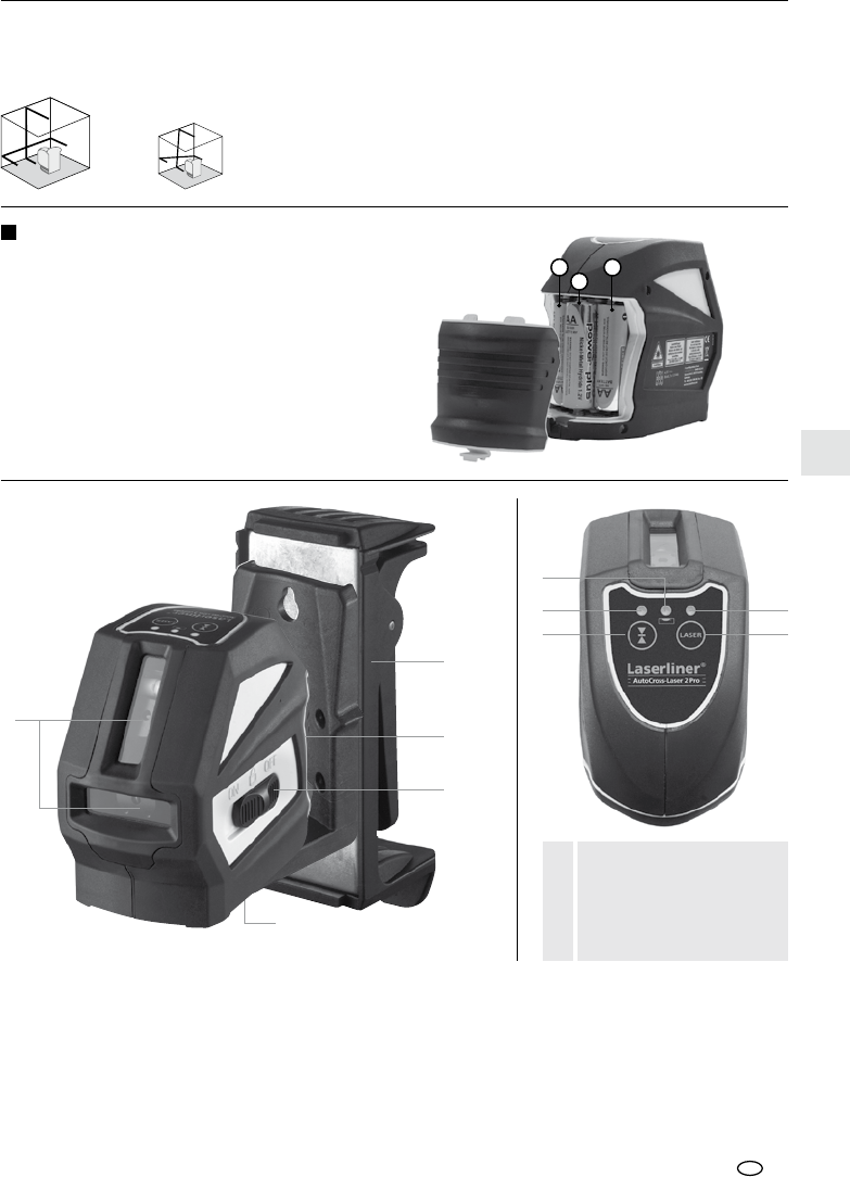 H = vaakalaserviiva / V = pystylaserviiva / S = Kallistustoiminto