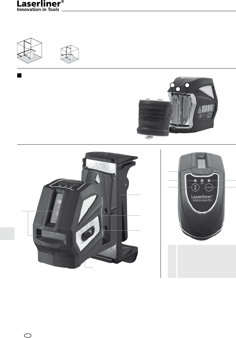 H = horizontální laserová čára / V = vertikální laserová čára / S = funkce sklonu
