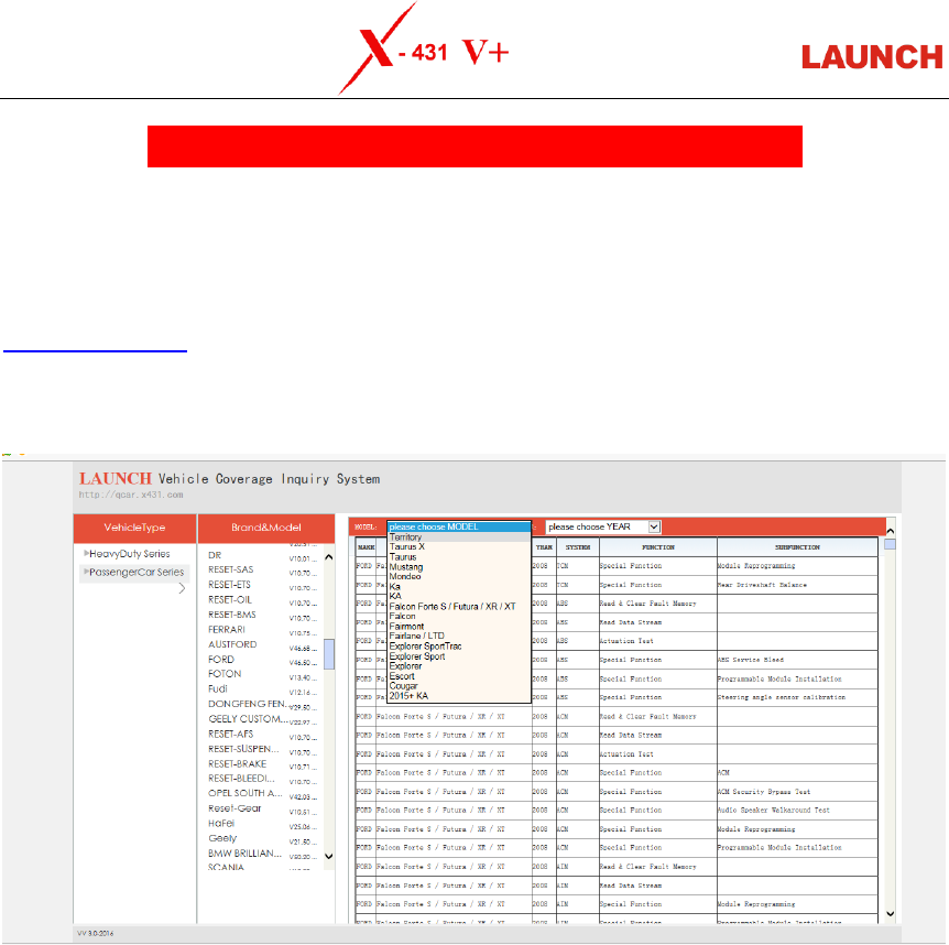 Vehicle Coverage and Supported Guidelines LAUNCH X431-V+ Launch X431 V+ supports over 94 car makes, over 1000 car models. For detailed supported functions, you can refer to launch official website: http://qcar.431.