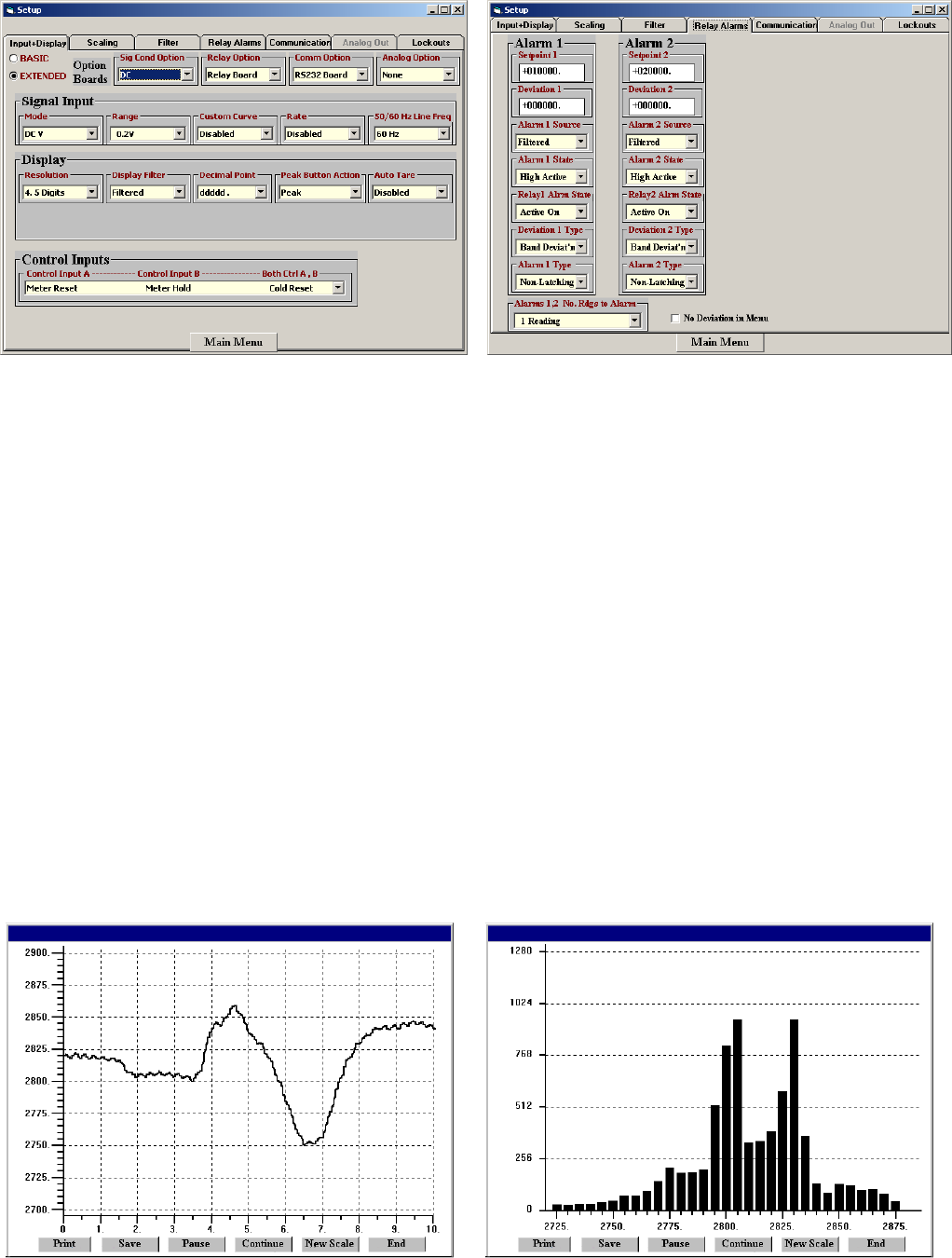 selectable windows for Input+Display, Scaling, Filter, Relay Alarms, Communications,