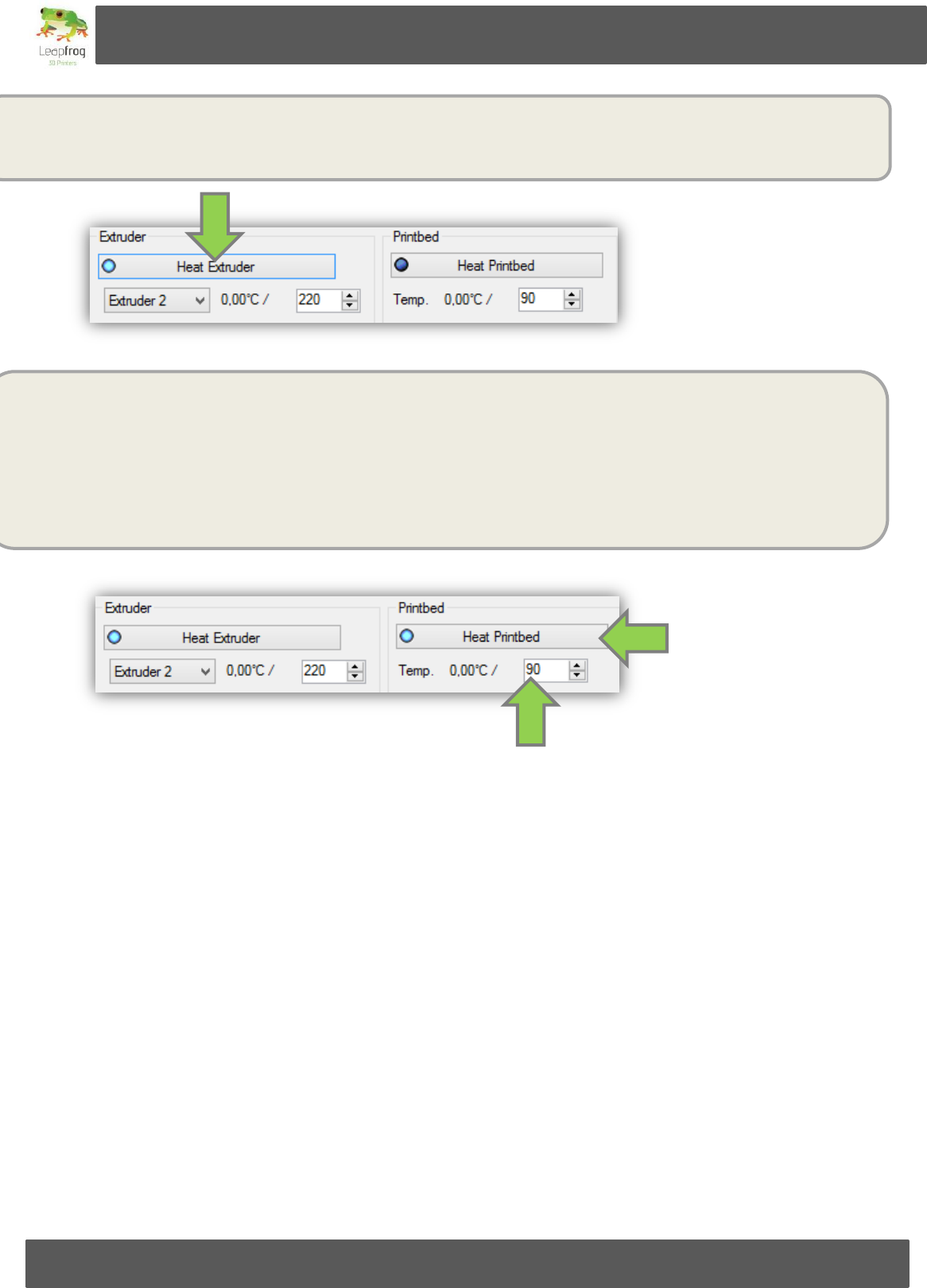 Set the temperature and click Heat Printbed”. The printbed needs to be heated in order for the