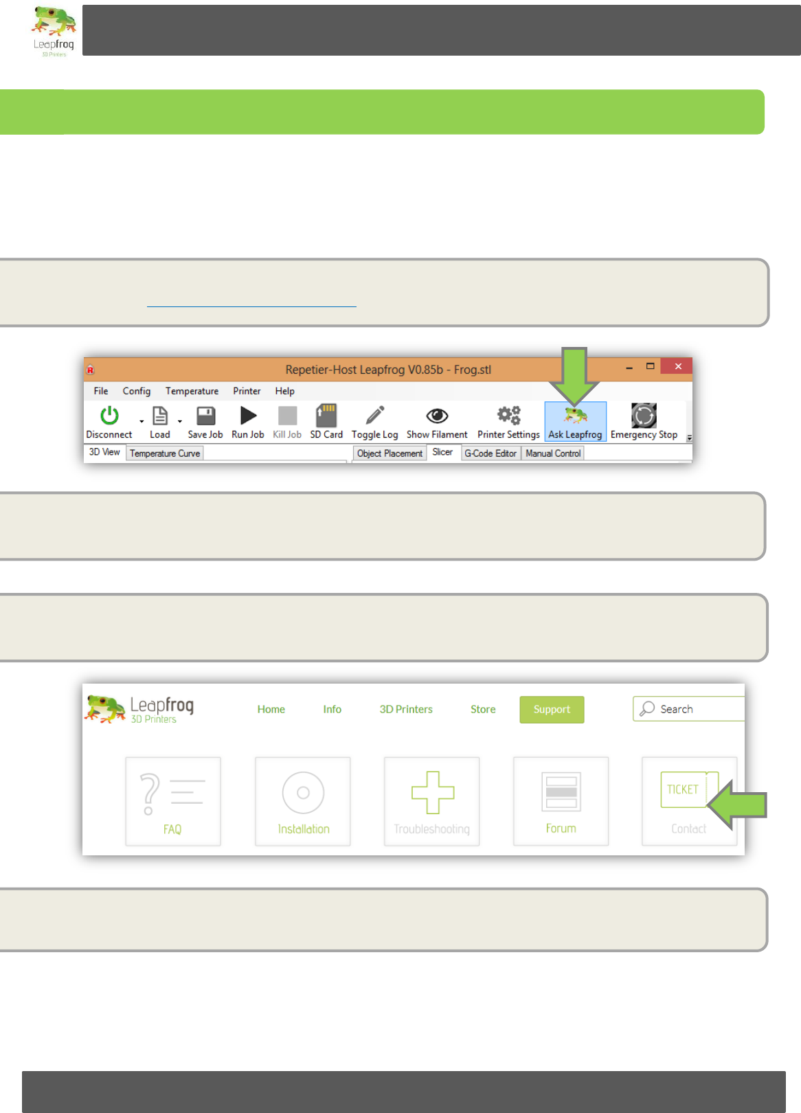 If you need support, click on the Ask Leapfrog” button in Repetier-Host Leapfrog or go to