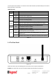Appendix D: Specifications General Standards and Protocols IEEE 802.3, 802.3u, 802.11n, 802.11b and 802.11g, TCP/IP, DHCP Safety & Emission FCC、 CE Ports One 10/100M Auto-Negotiation LAN RJ45 port, supporting passive PoE Cabling Type 10BASE-T: UTP category 3, 4, 5 cable (maximum 100m) EIA/TIA-568 100Ω STP (maximum 100m) 100BASE-TX: UTP category 5, 5e cable (maximum 100m) EIA/TIA-568 100Ω STP (maximum 100m) Wireless Frequency Band 2.4~2.