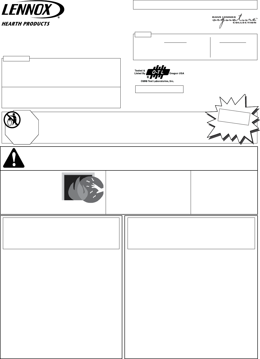 LENNOX HEARTH PRODUCTS • MONTEBELLO® DV GAS FIREPLACES (LSM40/45MN-2, LSM40/45MP-2, LSM40/45EN-2) • CARE AND OPERATION INSTRUCTIONS Important Safety Information L'information de sûreté importante 1. WARNING: Do not operate appliance with the glass front removed, cracked or broken. Replacement of the glass should be done by a licensed or qualified service person . 1. AVERTISSEMENT. Ne pas utiliser l’appareil si le panneau frontal en verre n’est pas en place, est craqué ou brisé.