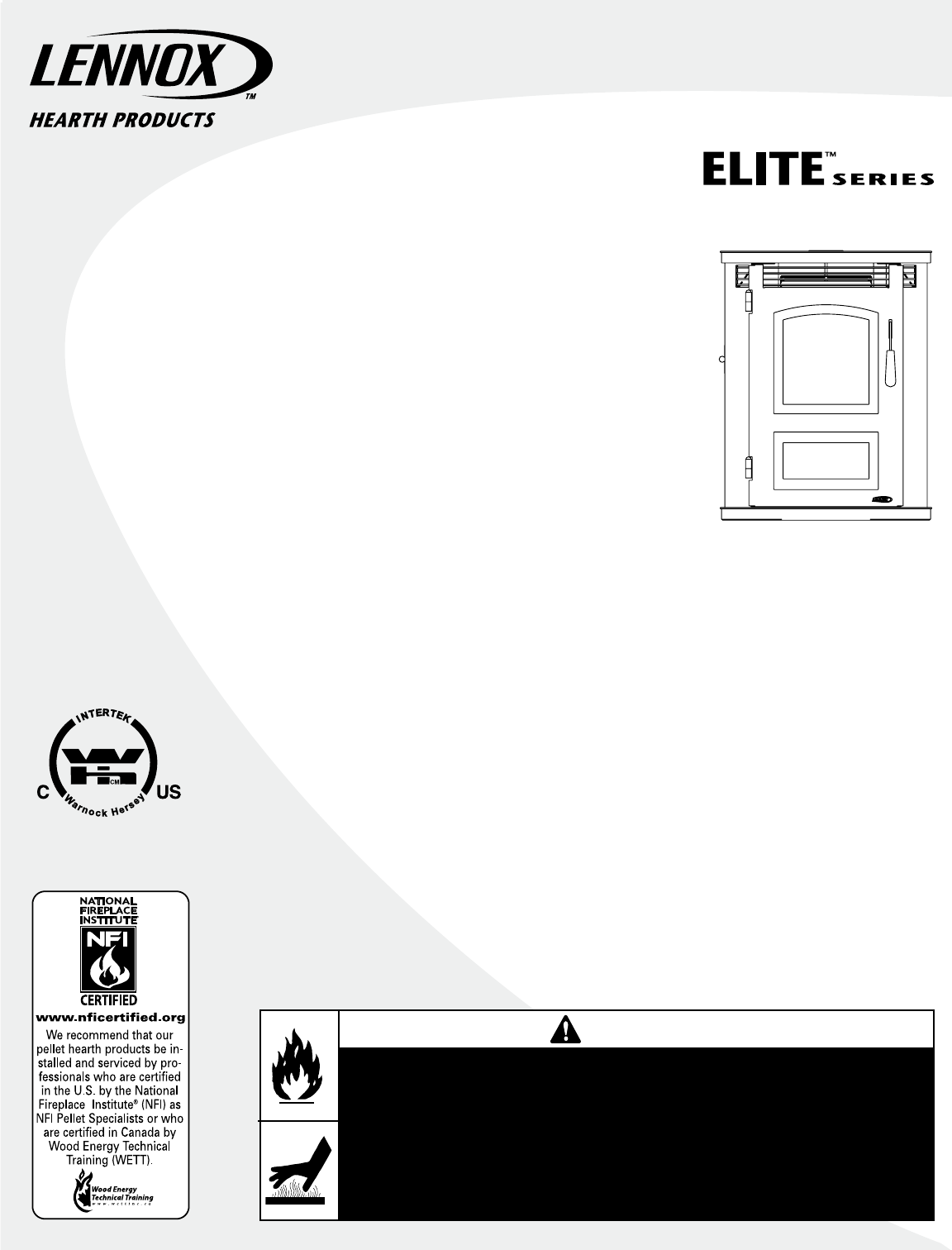 safety / listing label Manufactured By / Fabriqué Par: LENNOX HEARTH PRODUCTS PO BOX 987 Auburn, WA 98071 USA CERTIFIED FOR U.S. AND CANADA. LISTED ROOM HEATER FOR Report No./Numéro de Rapport: 3105656MID USE WITH PFI APPROVED PELLETIZED WOOD FUEL ONLY. FOR (Test Date OCT 2006 / Testé le OCT 2006) USE IN MANUFACTURED (MOBILE) HOMES. Serial No. INSTALL AND USE ONLY IN ACCORDANCE WITH THE MANU FACTURER’S INSTALLATION INSTRUCTIONS.