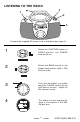 LISTENING TO THE RADIO 4 1 2 3 Connect the supplied AC power cord or batteries (see page 4). 1 2 3 4 Rotate the FUNCTION switch to RADIO position, the POWER lamp will be on. Rotate the BAND switch to the proper band position (AM or FM) that you want. Tune into the station you prefer using the TUNING control (at the right side of the set). Adjust for the clearest sound. The station you are listening will show in the window of the AM/ FM dial lens.