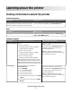 Learning about the printer Finding information about the printer Setup information Description Where to find The Setup information gives you instructions for setting You can find the Setup information on the inside of the printer up the printer. Follow the set of instructions for local, box or on the Lexmark Web site at www.lexmark.com. network, or wireless, depending on what you need. Help Description Where to find The Help gives you instructions for using the software.