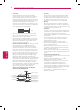 ASSEMBLING AND PREPARING Mounting on a table 1 Adjusting the angle of the TV to suit view Lift and tilt the TV into its upright position on a table. (For 32LN541C, 32LN549E, 32LP560M) - Leave a 10 cm (4 inch) (minimum) space from the wall for proper ventilation. Swivel 15 degrees to the left or right and adjust the angle of the TV to suit your view. 10 cm (4 inch) 10 cm 15˚ 15˚ m 10 c 10 cm 2 Connect the power cord to a wall outlet.