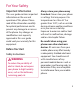 For Your Safety • Do not place any heavy items on the power cord. Do not allow the power cord to be crimped as it may cause fire or electric shock. • Do not handle the phone with wet hands while it is being charged. It may cause an electric shock or seriously damage your phone. • Do not disassemble the phone. • Do not place or answer calls while charging the phone as it may short-circuit the phone and/or cause electric shock or fire. • Only use the batteries, antennas, and chargers provided by LG.