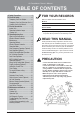 Safety Precautions Safety Precautions This symbol indicates the possibility of death or serious injury. This symbol indicates the possibility of injury or damage. ■ Meanings of symbols used in this manual are as shown below. Be sure not to do. Be sure to follow the instruction. Always use a power plug and socket with a ground terminal. • There is a risk of electric shock. For electrical work, contact the dealer, seller, a qualified electrician, or an Authorized Service Center.