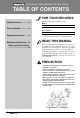 Safety Precautions Do not block the inlet or outlet of air flow. • There is risk of fire, electric shock, or damage to the plastic parts of the product. Do not touch the metal parts of the product when removing the air filter. They are very sharp! • There is risk of personal injury. x Wa Thinner Do not step on or put anyting on the product. (outdoor units) • There is risk of personal injury and failure of product. Do not drink the water drained from the product.