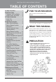 Safety Precautions Safety Precautions This symbol indicates the possibility of death or serious injury. This symbol indicates the possibility of injury or damage. n Meanings of symbols used in this manual are as shown below. Be sure not to do. Be sure to follow the instruction. Always use a power plug and socket with a ground terminal. • There is a risk of electric shock. For electrical work, contact the dealer, seller, a qualified electrician, or an Authorized Service Center.
