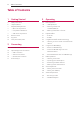 Table of Contents Table of Contents 1 Getting Started 3 Operating 2 6 7 7 7 7 8 10 12 Safety Information Unique Features Playable file Requirement – Music file requirement – Compatible USB Devices – USB device requirement Remote control Top panel Front panel / Rear panel 18 18 19 2 Connecting 14 15 15 15 16 17 AC Power Cord Connection Optional Equipment Connection – USB Connection – Antenna Connection – OPTICAL IN Connection LG Sound Sync Basic Operations – USB Operations – Selecting a folder