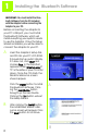 1 Installing the Bluetooth Software IMPORTANT: You must install the Blue- tooth Software from the CD included with the Adapter before connecting the Adapter to your PC. Before connecting the Adapter to your PC’s USB port, you must install the Bluetooth Software, which will install everything your system needs to use the Adapter. Once this Setup Wizard is installed, you will be able to connect the Adapter to your PC. A Insert the Adapter’s Setup Wizard CD into your PC’s CD-ROM.