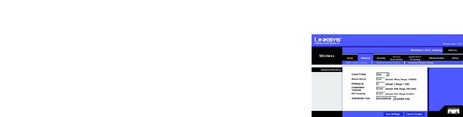 On this screen you can access the Advanced Wireless features, including Authentication Type, Basic Data Rates,