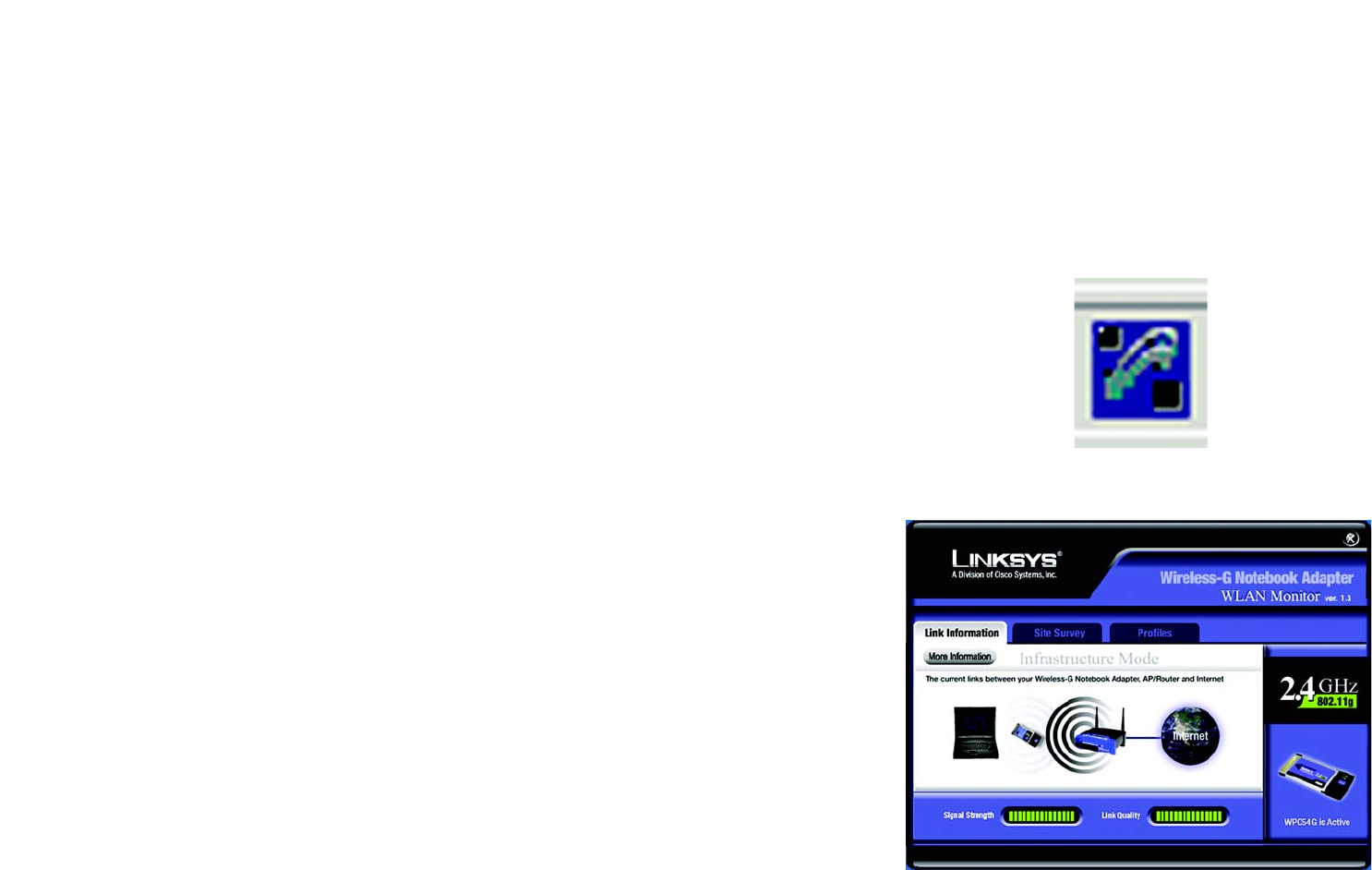 After installing the Adapter, the Wireless-G Notebook Adapter WLAN Monitor icon will appear in your system tray.