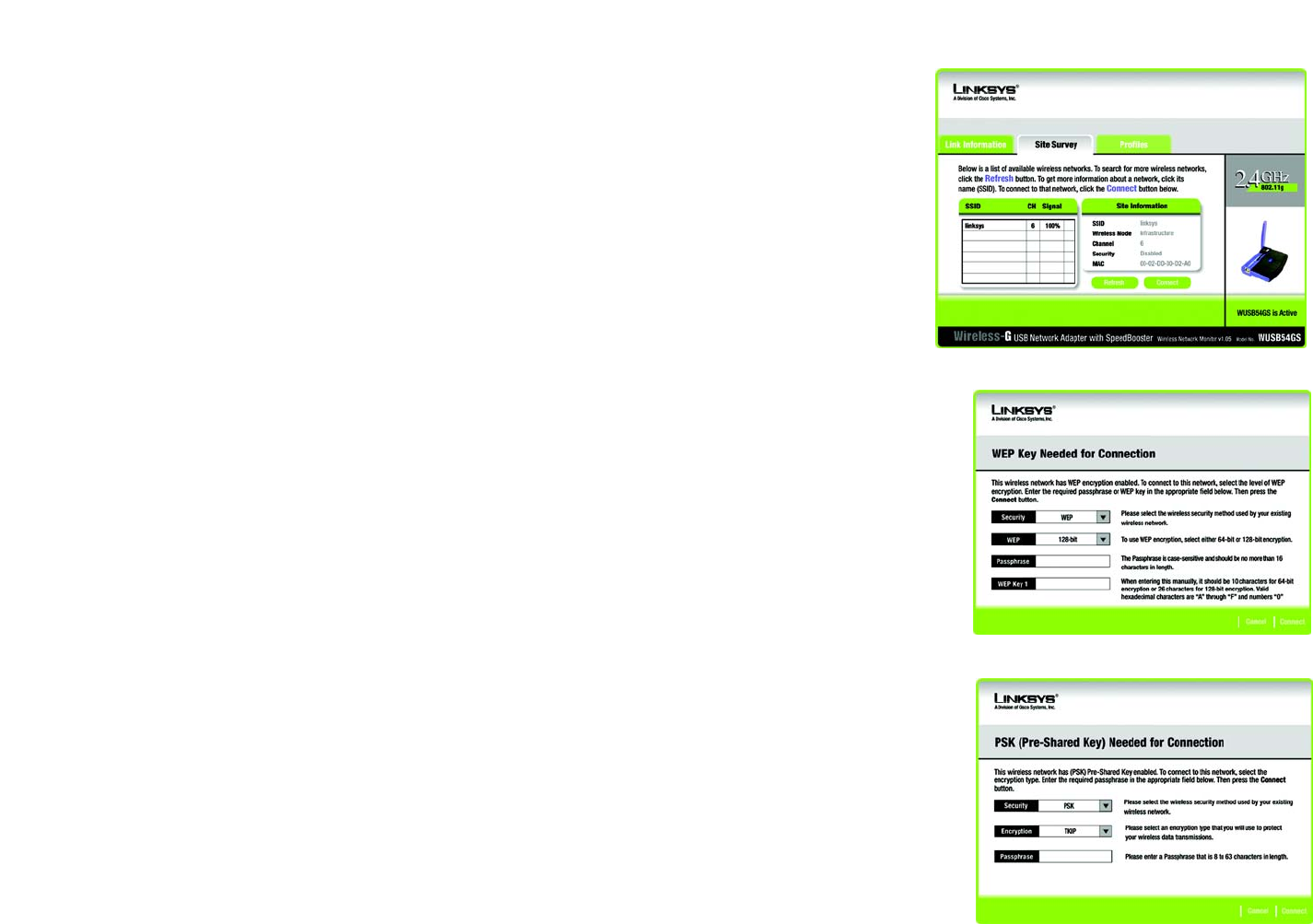 WEP encryption, 64-bit or 128-bit. Then enter the network’s Passphrase or WEP Key. Click the Connect button.
