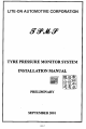 TOMS TYRE PRESSURE/TEMPERATURE MONITORS SYSTEM (PATENT PENDING) INSTALLATION MANUAL 1. Specifications A. Pressure Sensor Pressure Range: 0 90 PSI Input Voltage: Temperature Measuring Range: -40°C to 125°C (SENSOR) Work Temperature: -40°C to 1257 Life: 7 YEARS Min Frequency: 433.92MHz, 315 MHz(OPTION) Speed B. Display Unit Input voltage: 9~16V Standby Current's Max Frequency: 433.92MHz, 315 MHz(OPTION} Work Temperature: -40°C to 85°C Display: temperature, pressure status indicator, Audio Alarm 2.
