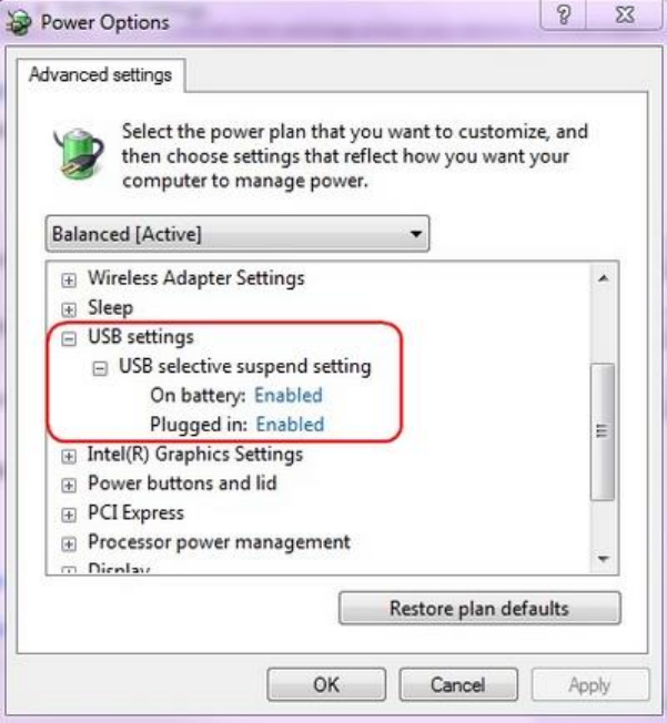 ‘Plugged in’ to a power outlet, select Disabled in the Plugged in list and then