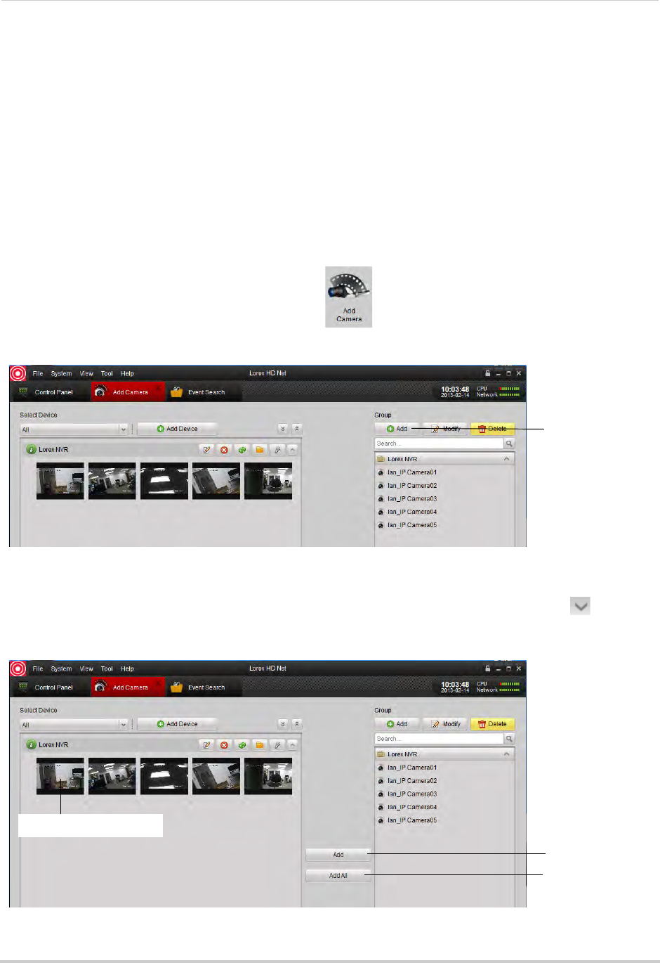 The Add Camera menu allows you to manage camera groups. When an NVR is added to the