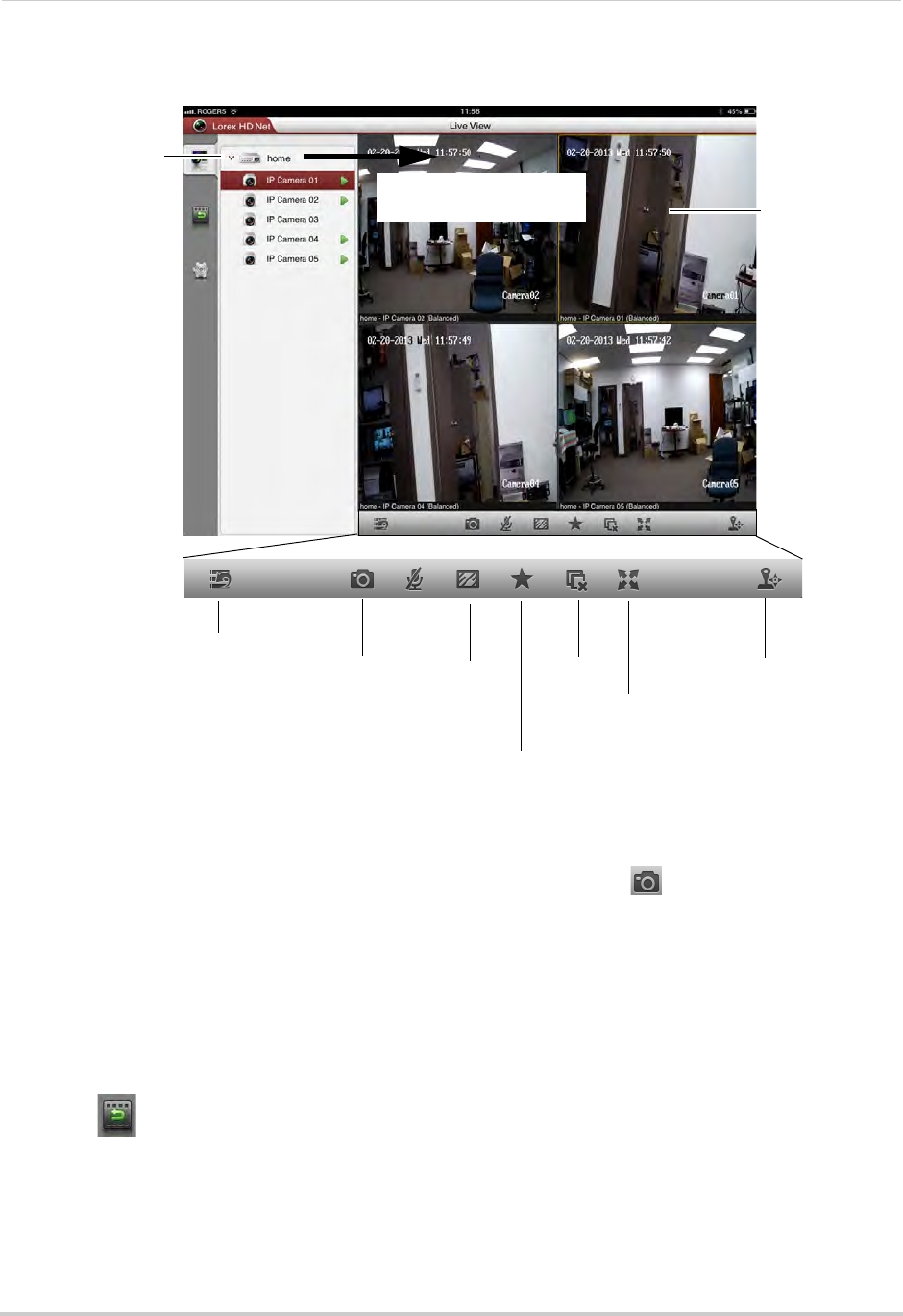 1 Tap the camera you would like to take a screenshot of, then tap .