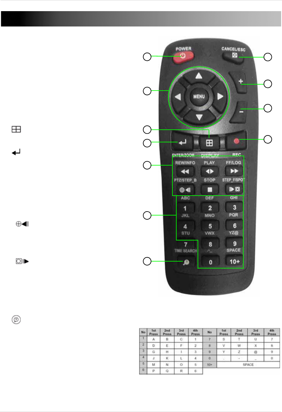 - 6. Channel buttons: Press to view channels 1~8 individually in full-screen; press to input passwords; when entering camera titles, press for alpha-numeric characters.
