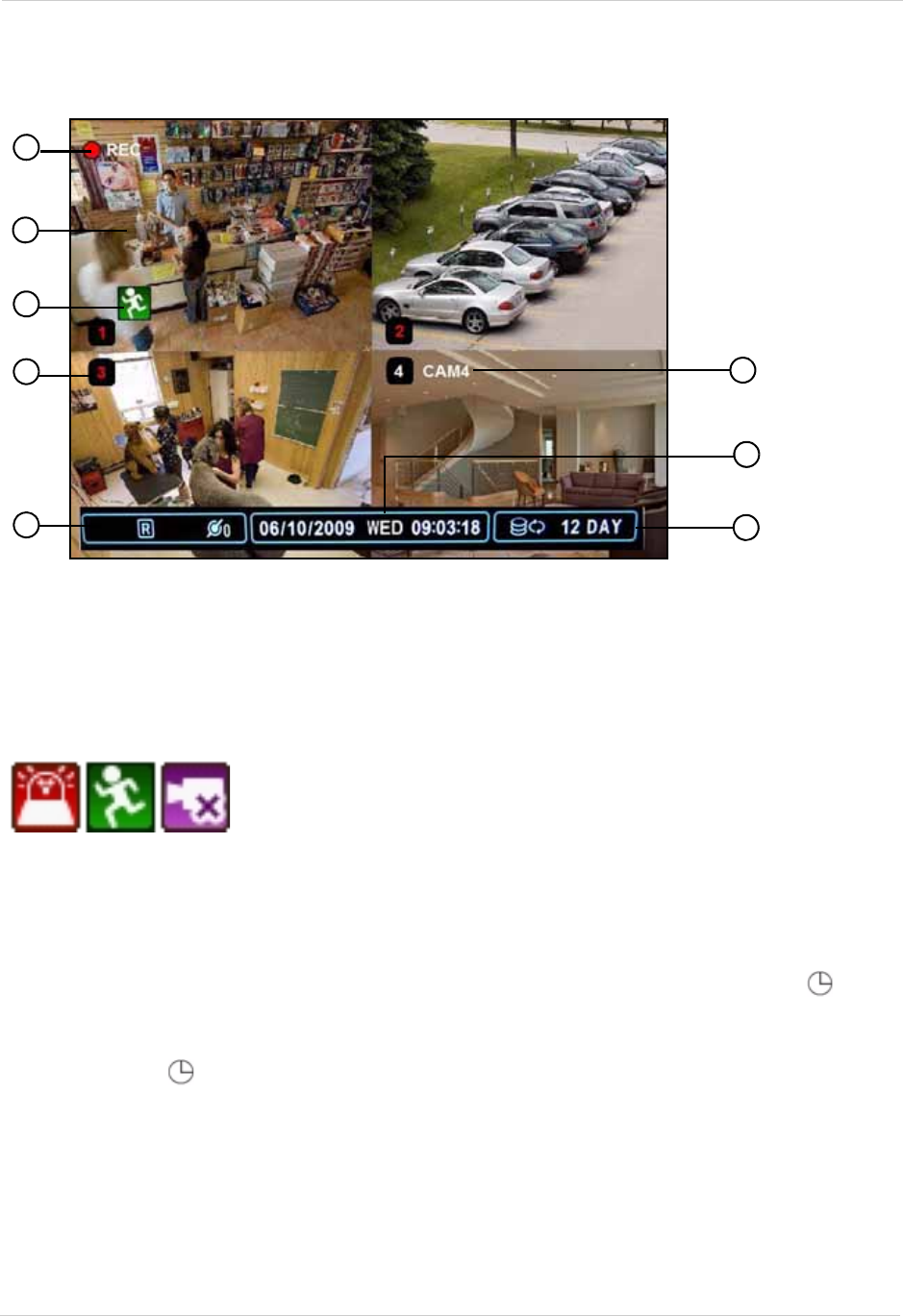 - 1. Recording: "REC" indicates that continuous recording is enabled on at least one channel.