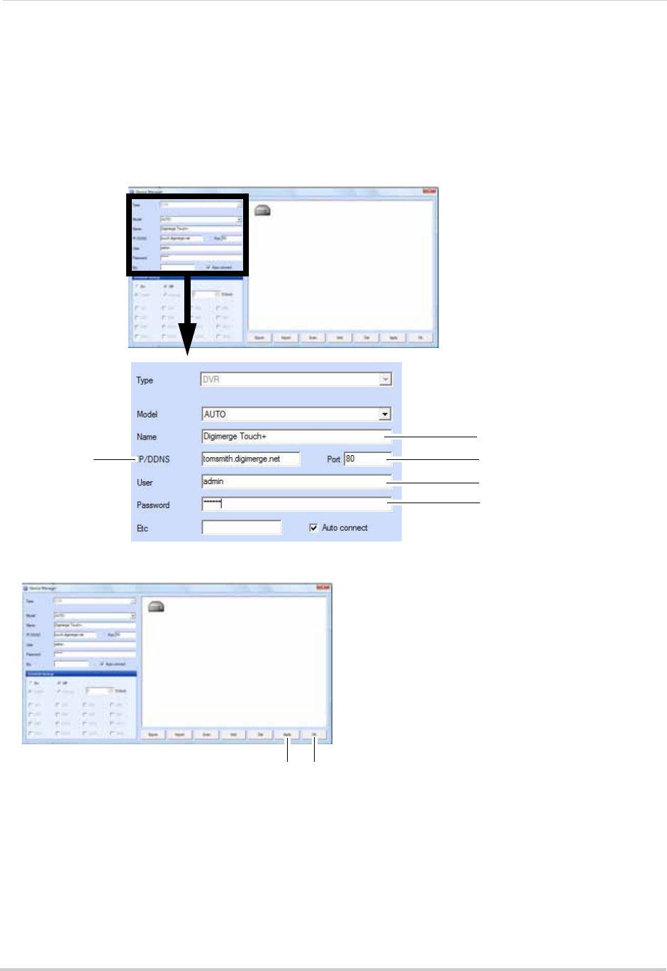 • IP/DDNS: Enter the DVR’s DDNS address (for example tomsmith.digimerge.net)