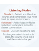\ Listening Modes Standard - Default, amplifies low sounds and compresses loud noise best for quiet environments. Advanced - Adds Adaptive Noise reduction to standard mode for clearer conversation. I Telecoil - Use with telephone calls To change modes it is a simple press, the volume knob clicks and the mode is changed.